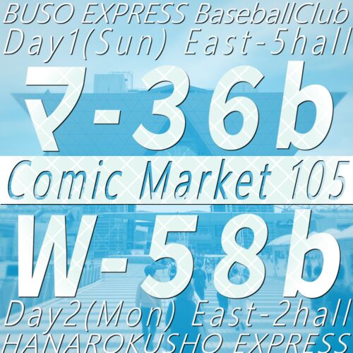 ◎イベント情報 ◎頒布物情報 1日目ピックアップ(野球観戦記) Ⅰ①【新刊】Ballfield eXpress Vol.1 ¥400 Ⅰ② 我は今、エスコンフィールド。 ¥600 Ⅰ③ 俺ら社会人野球東京地区さ行ぐだ ¥800 Ⅰ④ Onigiri TAbetai STADIUM ¥300 Ⅰ⑤ 日本社會人棒球迷、去臺灣。…